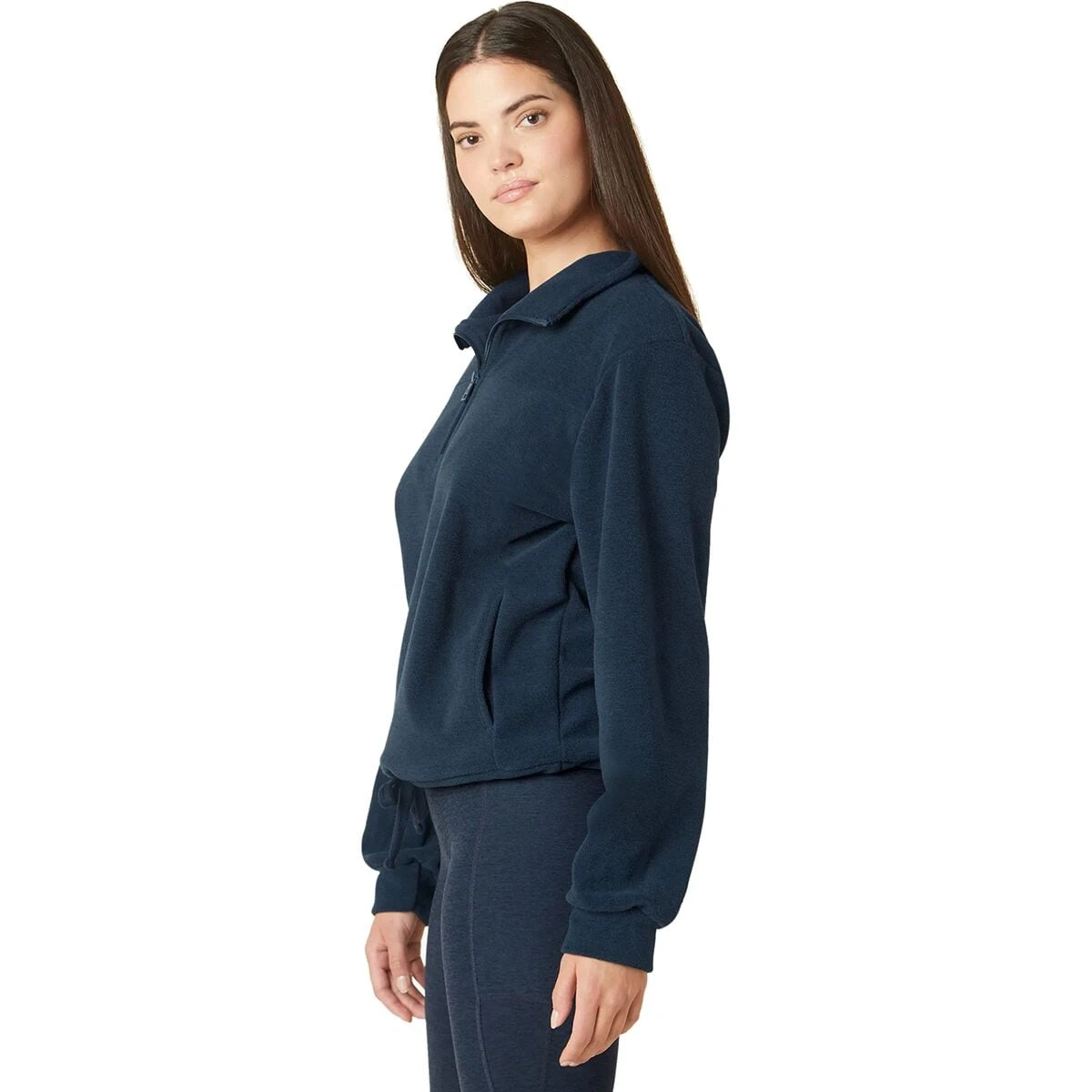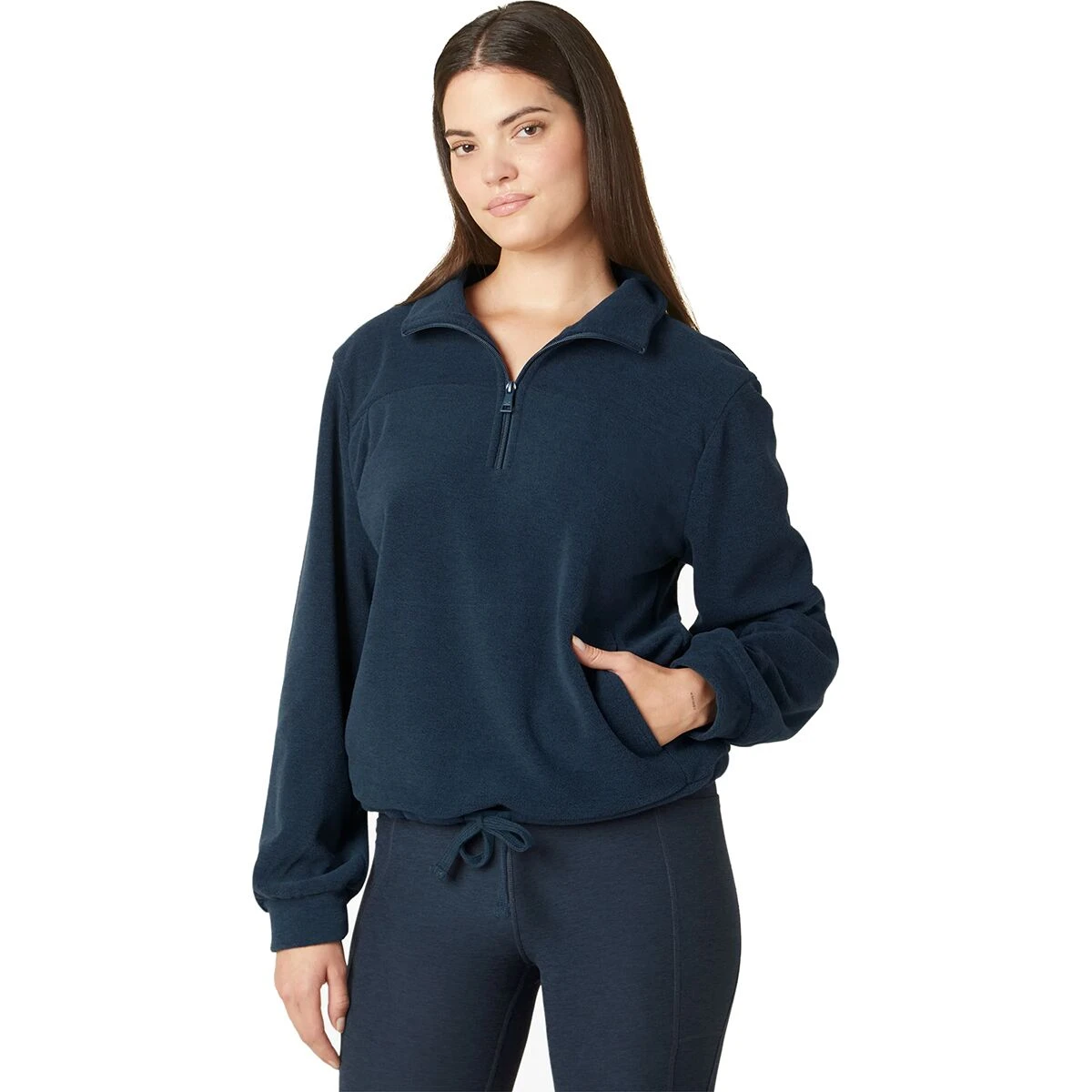 With an ultra-soft, low-pile fleece and quarter-zip front, the Beyond Yoga New Terrain Pullover keeps us cozy and warm on our relaxing days.