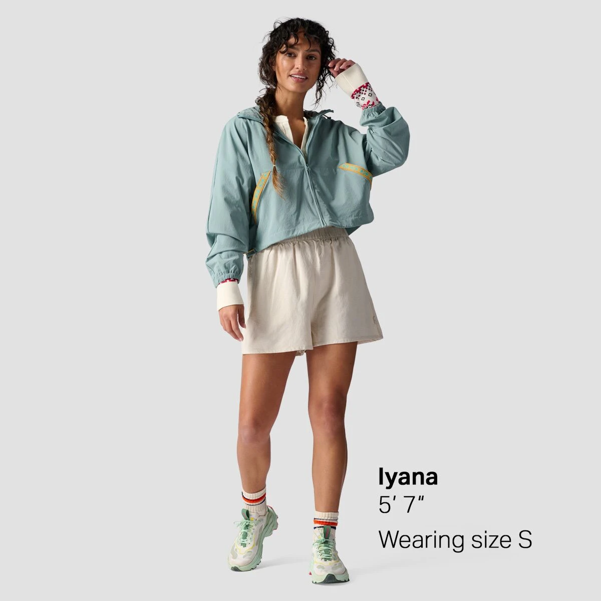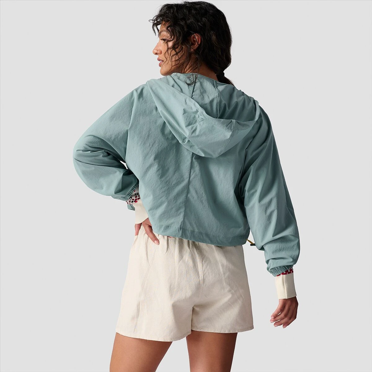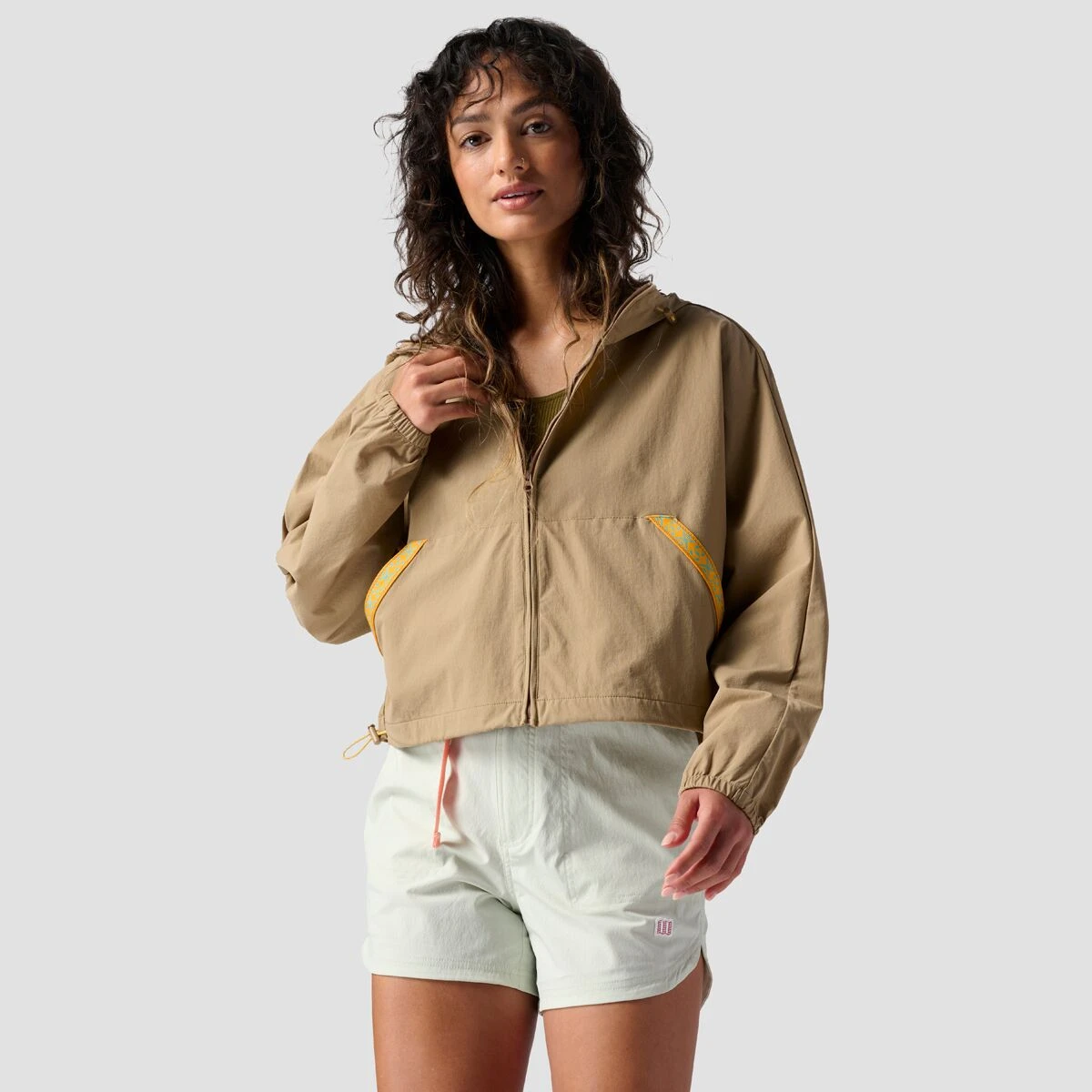 Our Cropped Full Zip Hooded Jacket features a modern, boxy fit and soft material for an effortlessly cool and comfy style in the shoulder seasons. Our exclusive print webbing on the pockets adds eye-catching detail, while drawcord adjustments at the hood and hem let us customize our fit.
