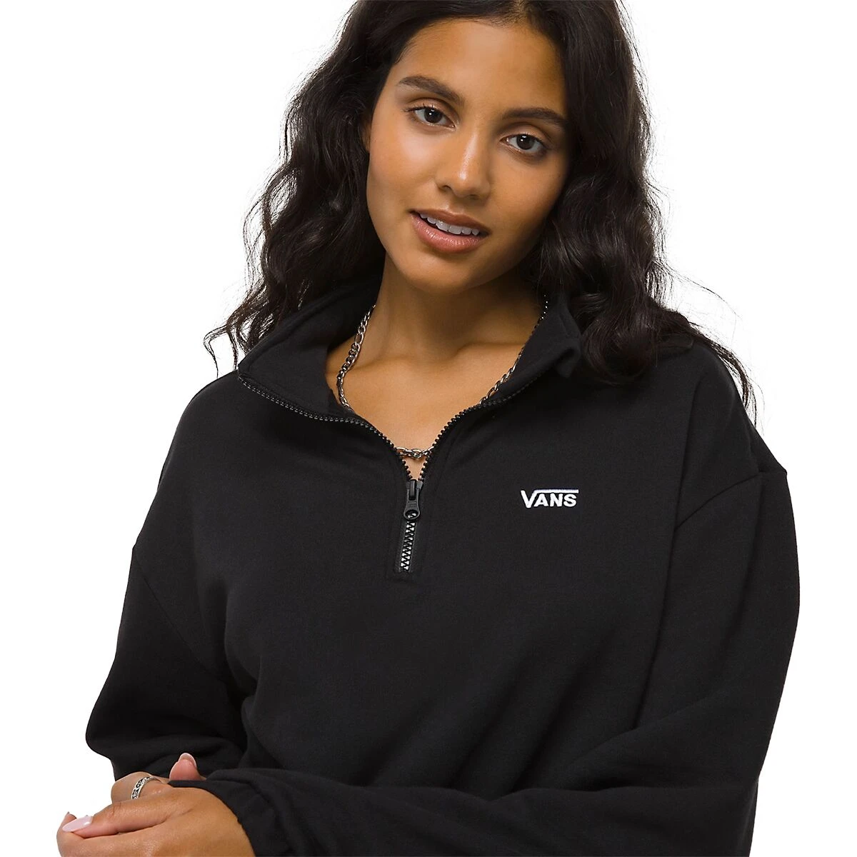 The Left Chest Half Zip Fleece is a 100% cotton pullover sweatshirt with a mock neck, quarter zip, and a cropped blouson fit. It also features a bungee and toggle at the waist, elastic sleeve cuffs, and classic logo embroidery at the chest.